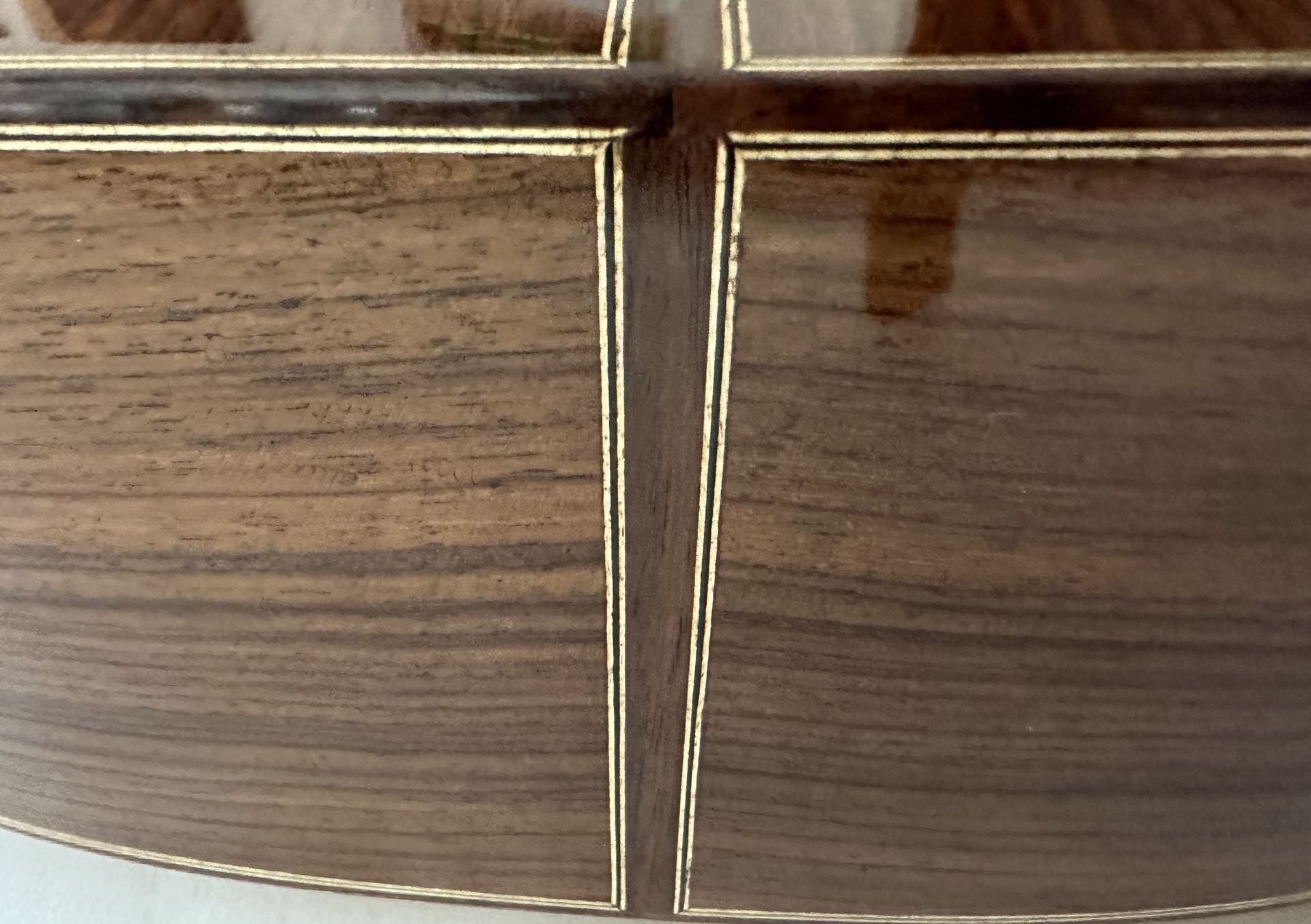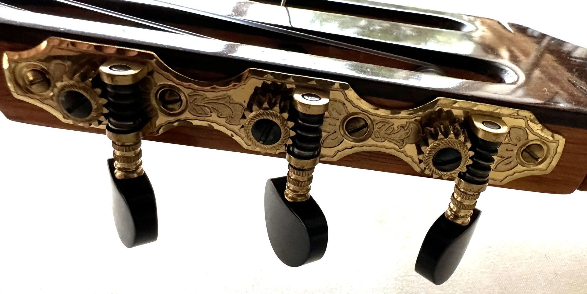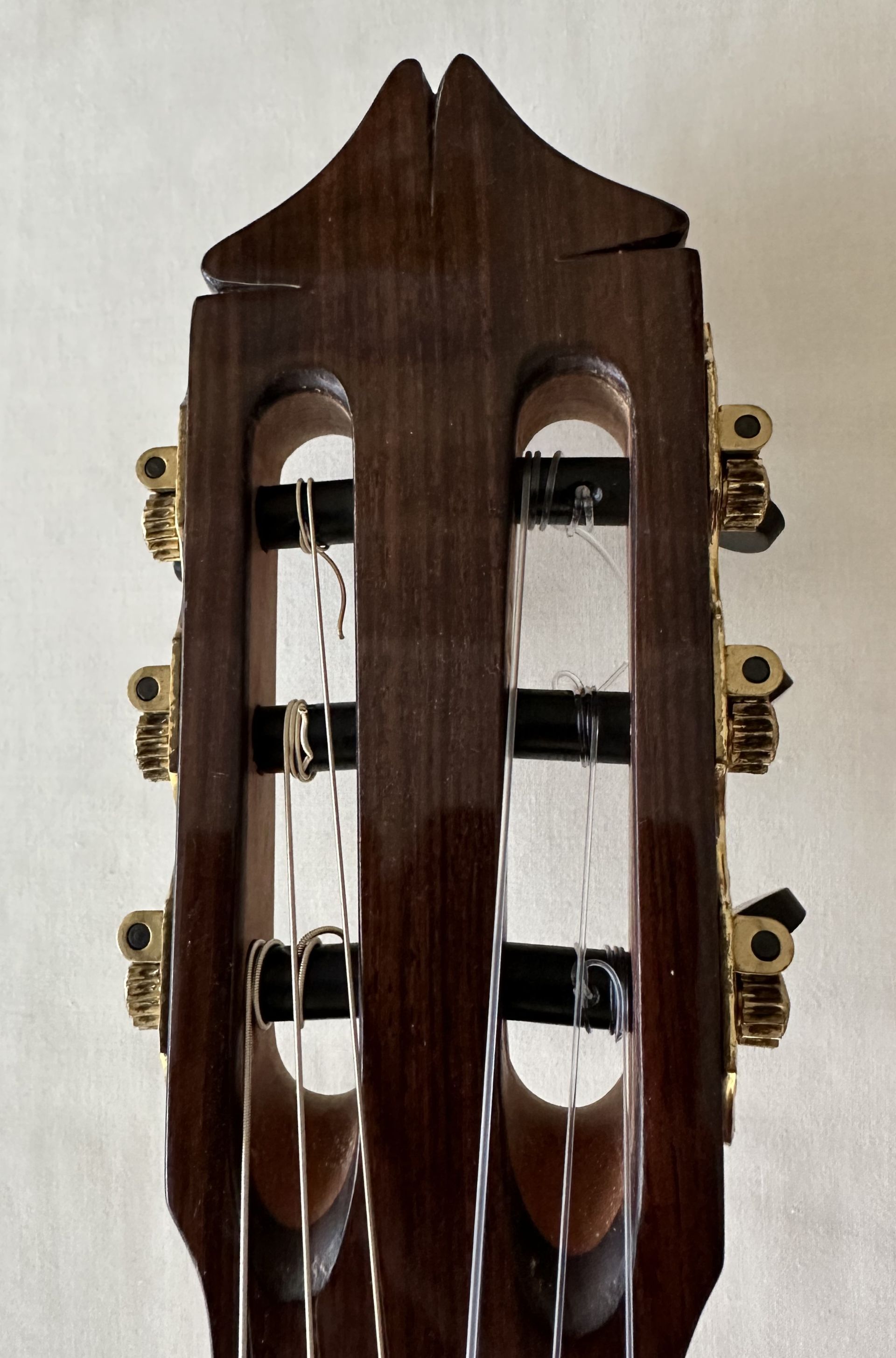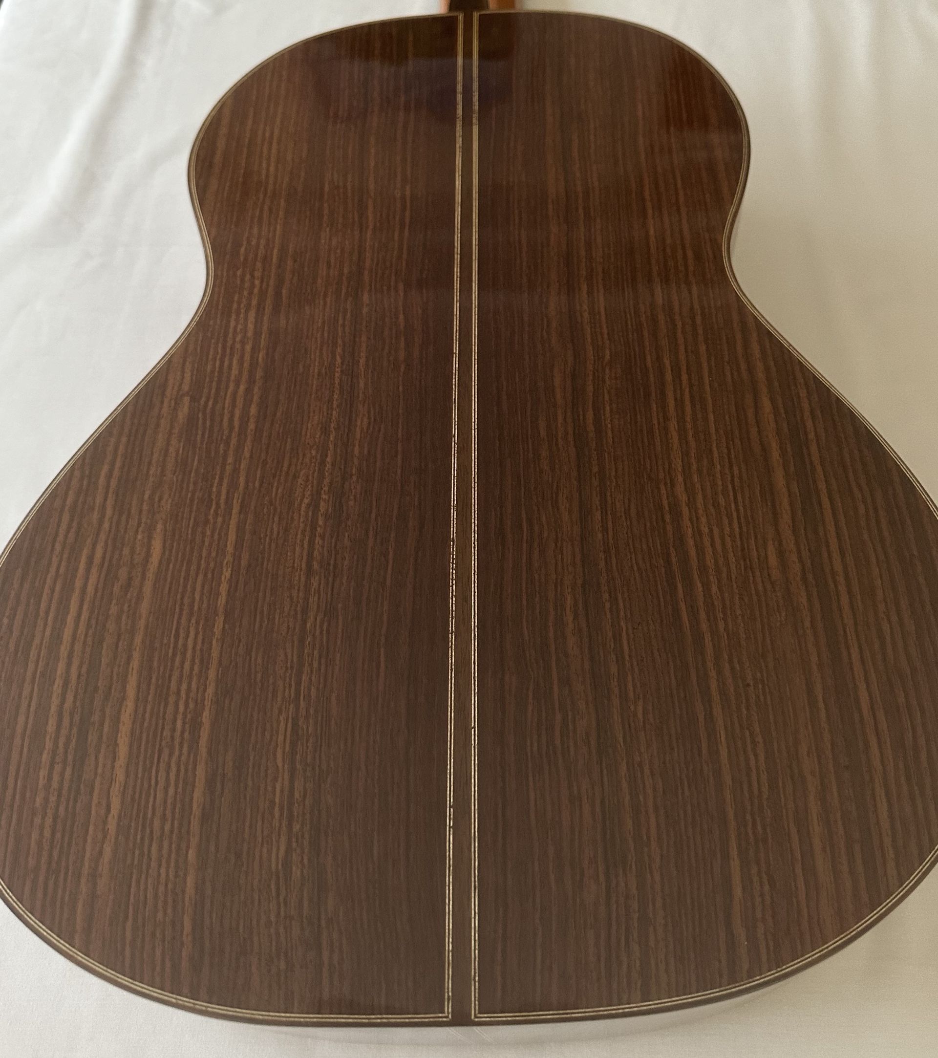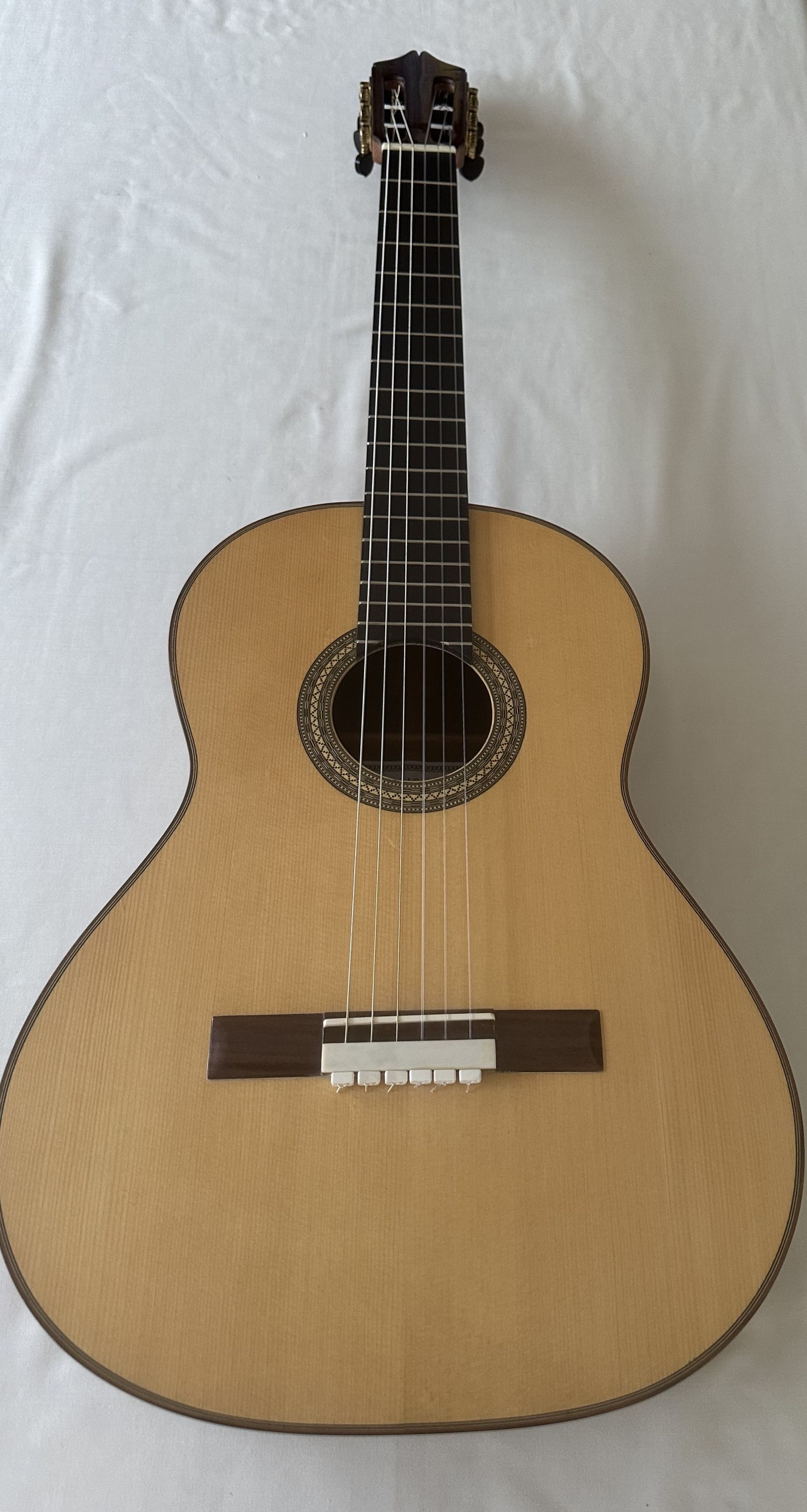 This guitar is somewhat unusual with having a scale length of 630mm. Spanish guitars generally have the standard 650mm scale lengths, and sometimes 640mm. So it's likely that the guitar was a special commission for a client with smaller hands or stretch issues. The guitar features a Spruce top and Indian Rosewood back and sides, with an Ebony fingerboard. Overall its condition is very good with little evidence of playing marks and the quality of workmanship is very high as one would expect from an experienced luthier with passion for musical instruments. The sound is typically Spanish with bright trebles and good bass response. Sound projection is very good though the volume is probably slightly down on that from a large bodied full scale guitar as one would expect. So the guitar has an intimate feel both in sound and the playing experience. As expected, the shorter scale length makes the guitar particularly easy to play and would suit a player with smaller hands or seeking a quality instrument to move to from the larger standard scale instrument.