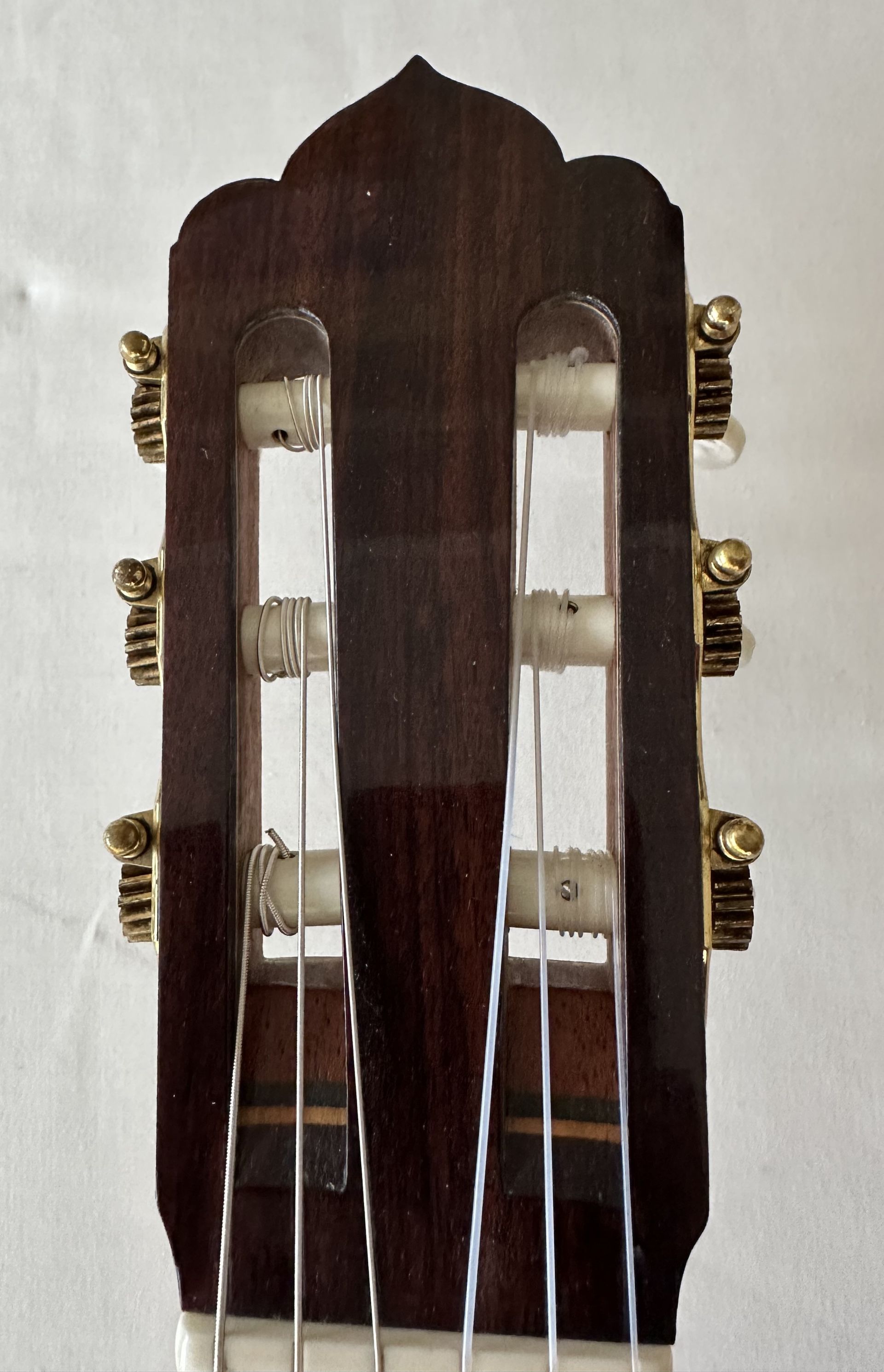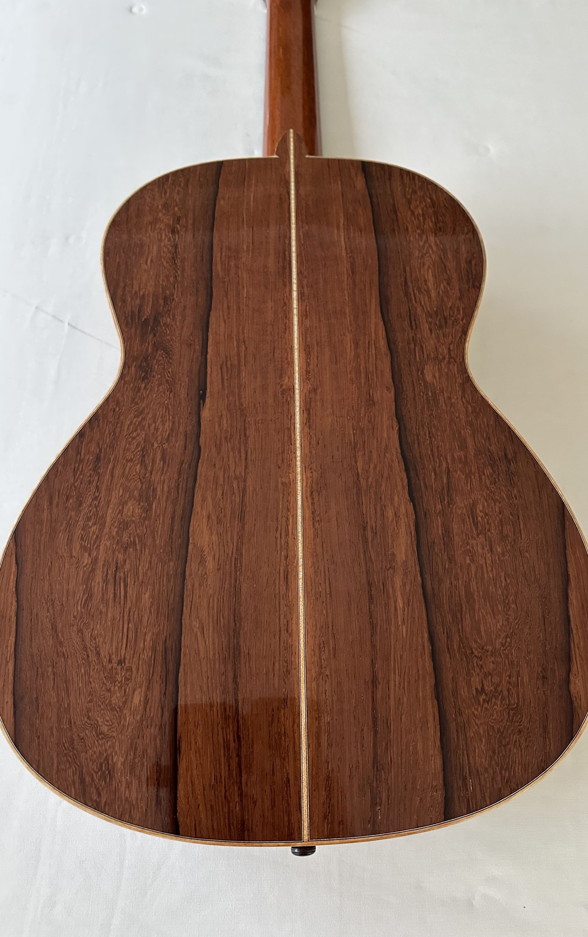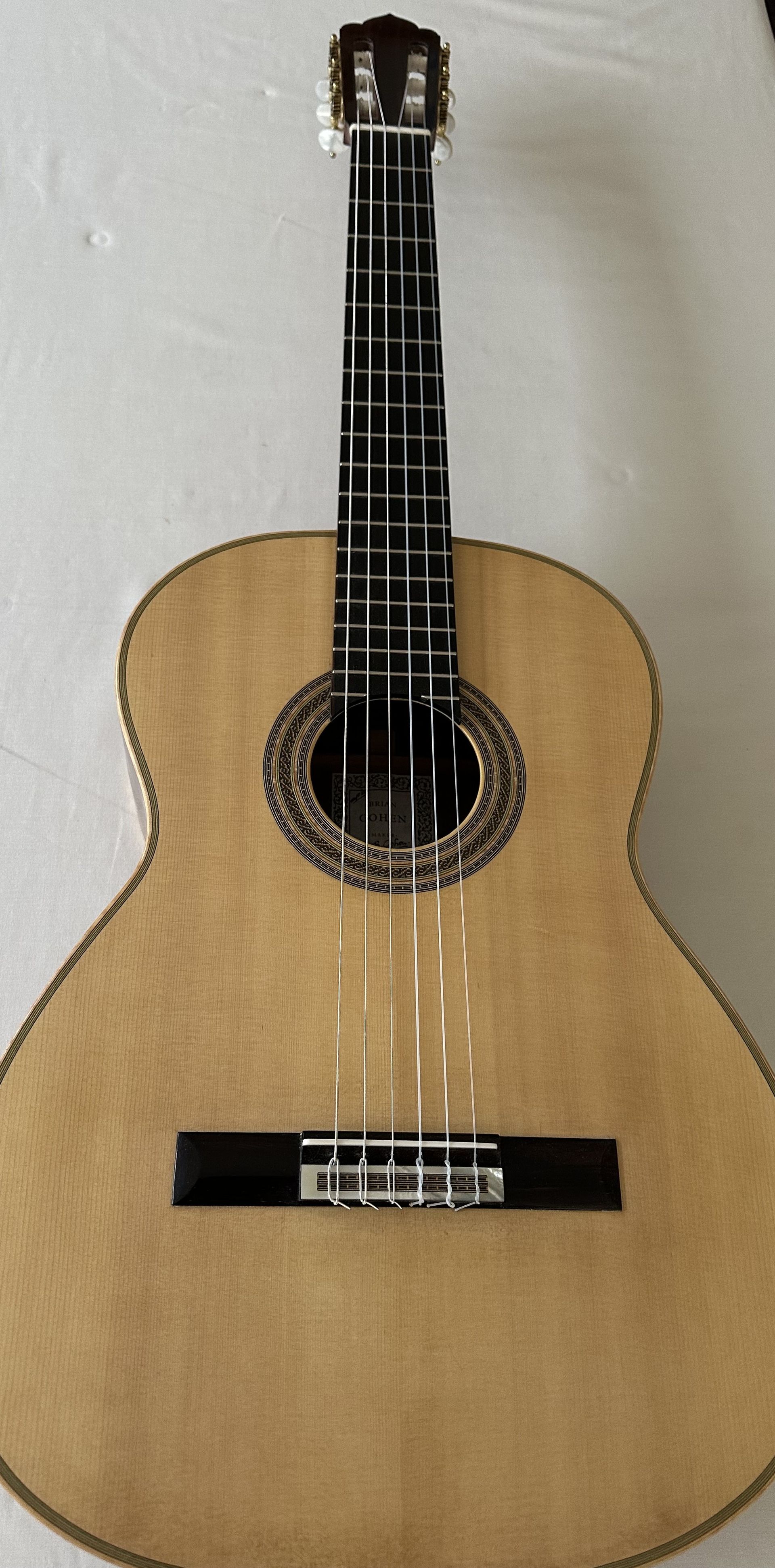 The guitar has a Spruce top and book-matched Madagascar Rosewood back and sides. It was built in 2022 and has had little playing during its lifetime. Brian did make a small repair to the shellack finish and this has restored the guitar to virtually mint condition. When it was originally built Brian fitted an under-saddle pick up which he has now removed and the removable plug in the lower bout was designed by him during manufacture. As with Brian's guitars generally, the decoration is restrained and elegant but showing the highest level of craftsmanship. The relatively new Spruce top gives a bright sharp treble response and the bass is loud firm and secure. The tuning machines are Rodgers. For anyone wishing to own an example of Brian's recent work, the guitar represents an opportunity to do this at a fraction of the new price.