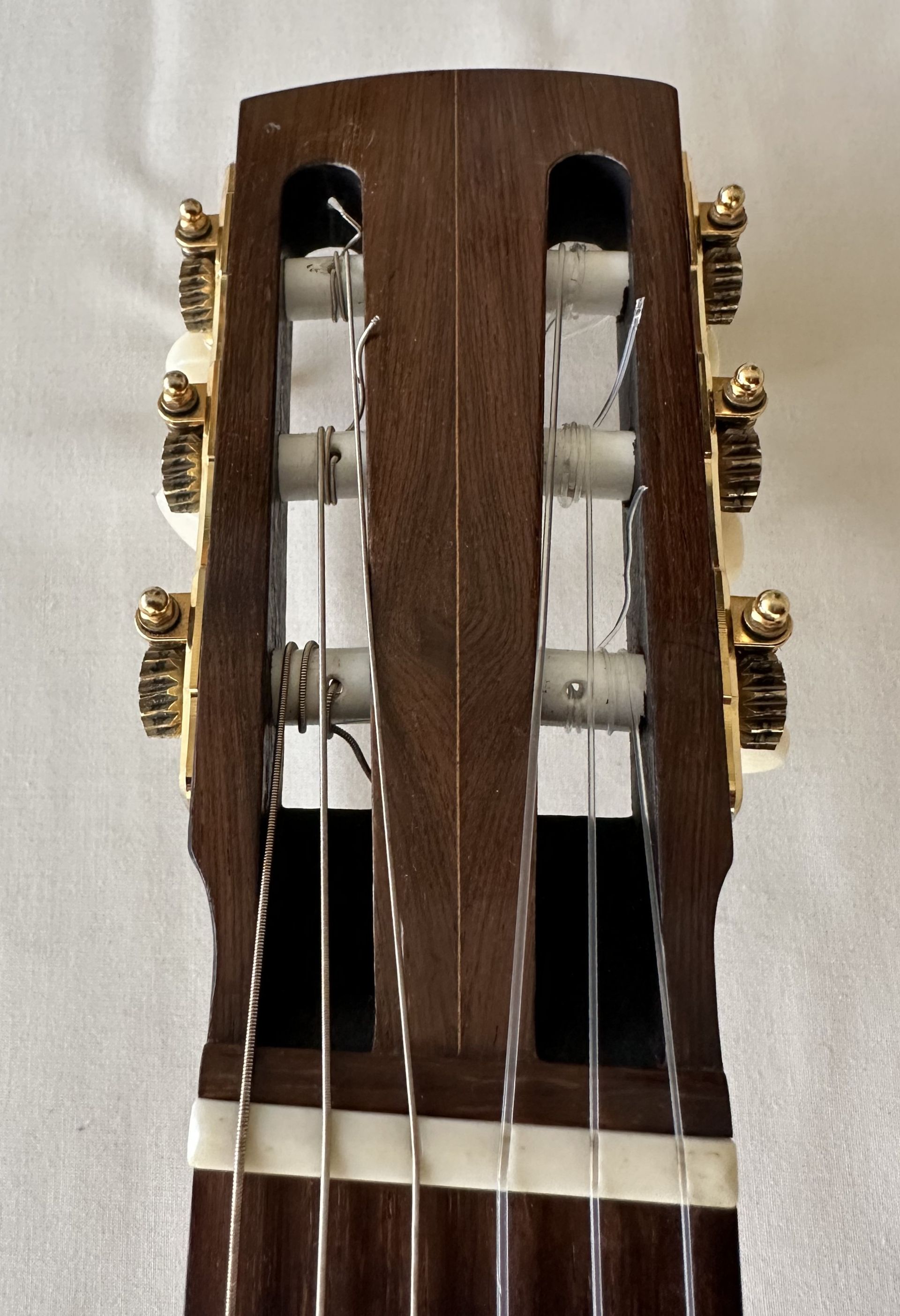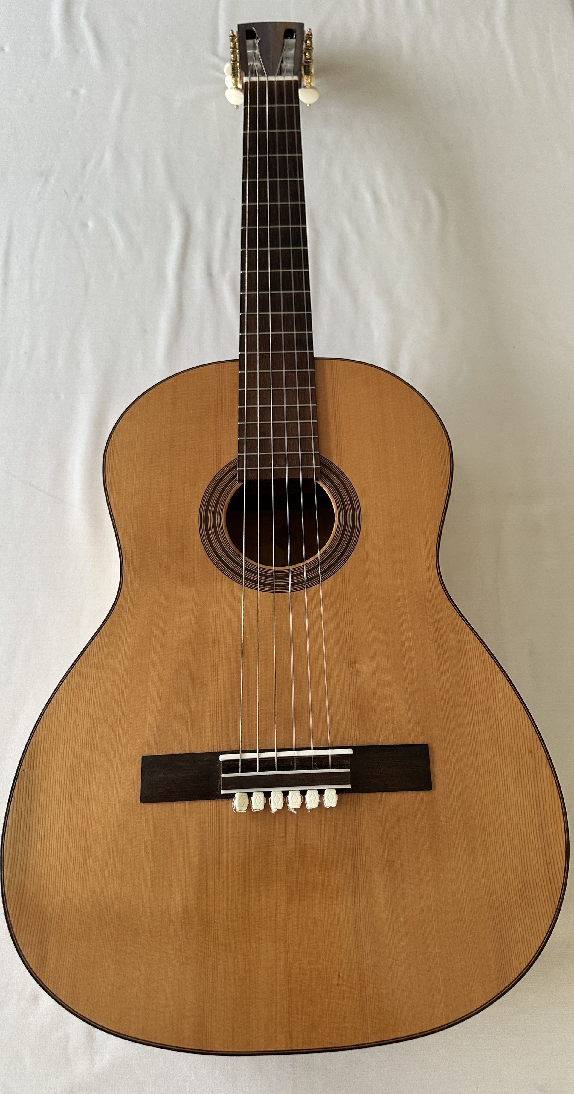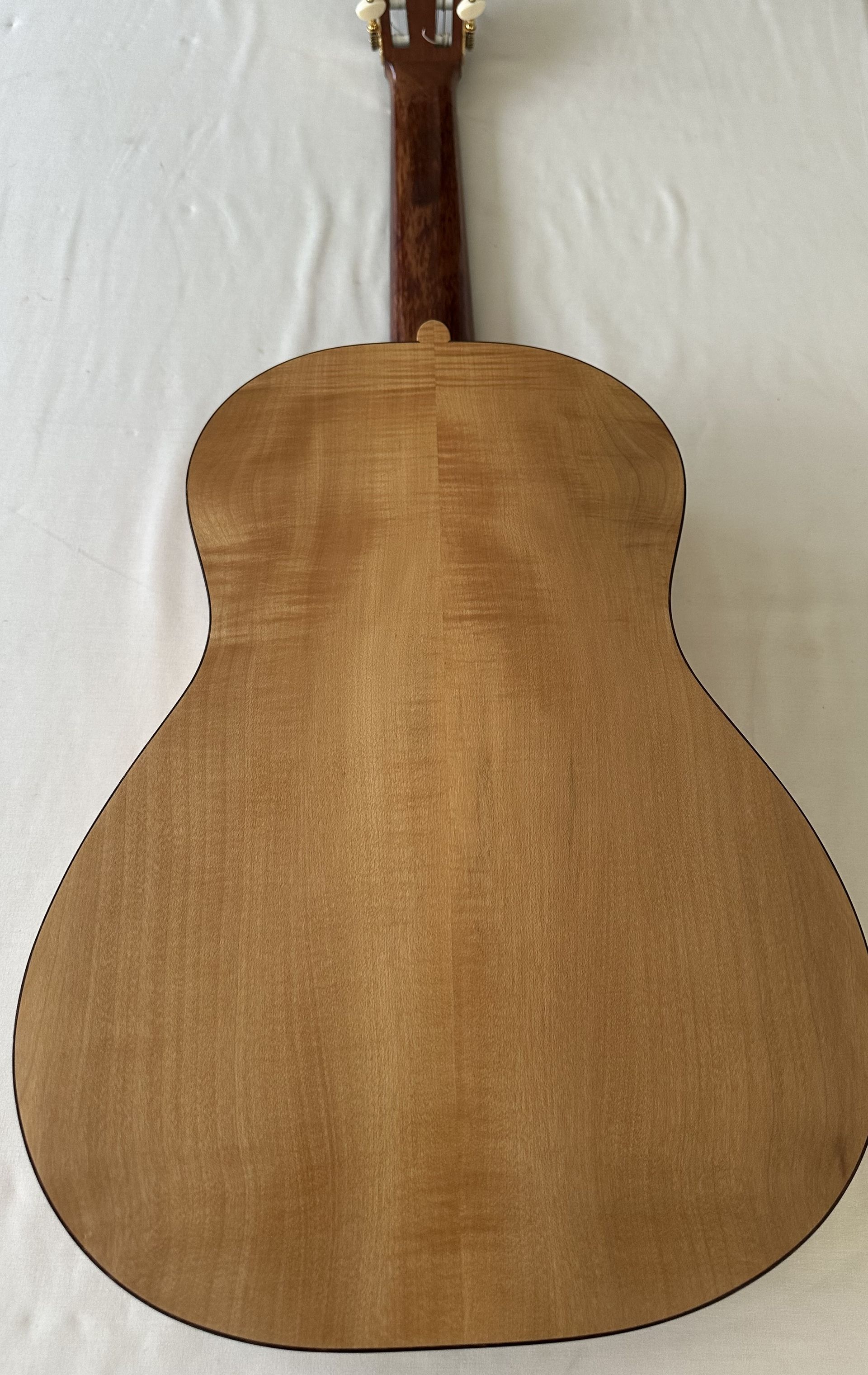 The guitar was made in 2001 and comprises a Spruce top with flamed Maple back and sides. Interestingly the Spruce top is one of the thinnest I have ever come across on a classical guitar, and this help towards its very light feel. The body is smaller than the normal classical guitar and has the small bodied Torres feel. The action is low, around 3mm at the 12th fret, and the neck is straight. it has a 52mm nut width and a 630mm scale length. The bracing is 7 fan and very similar to Torres. A combination of the thin top and Maple back and sides results in a guitar which is bright and responsive, and despite the smaller body size has ample projection. It does show some signs of having been played, which adds to the patina of this interesting guitar.
