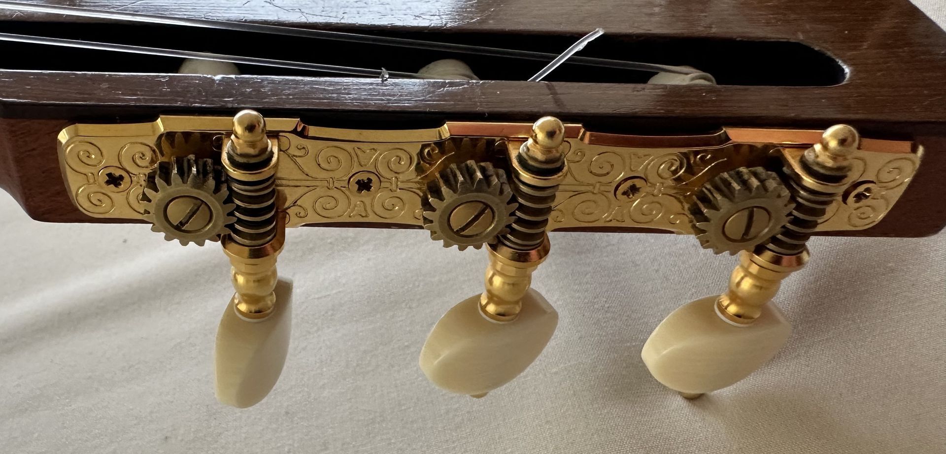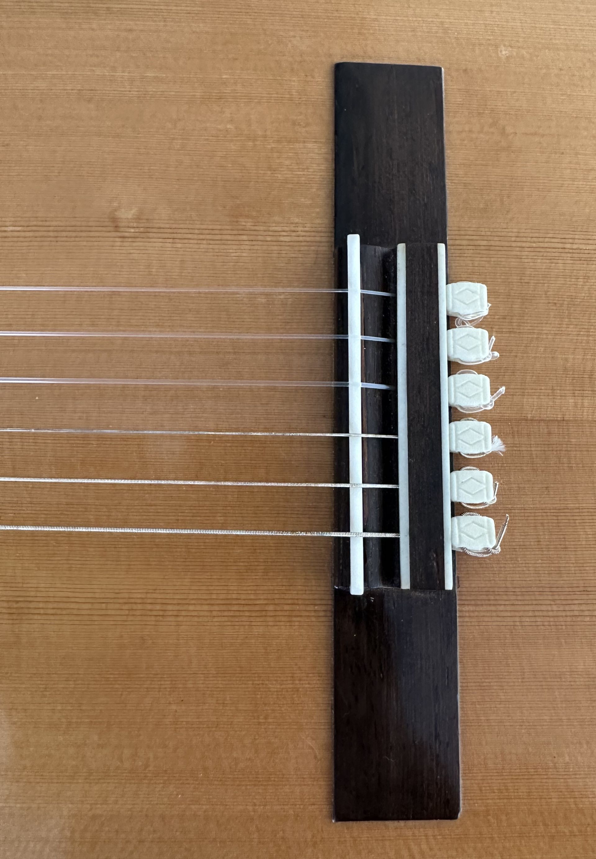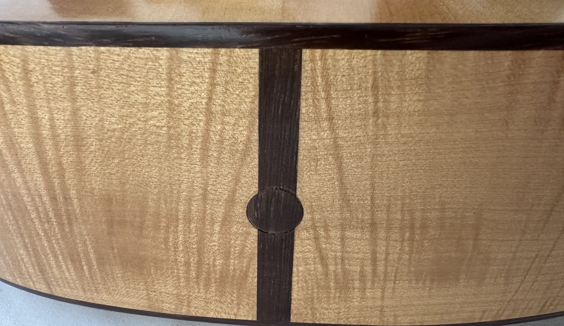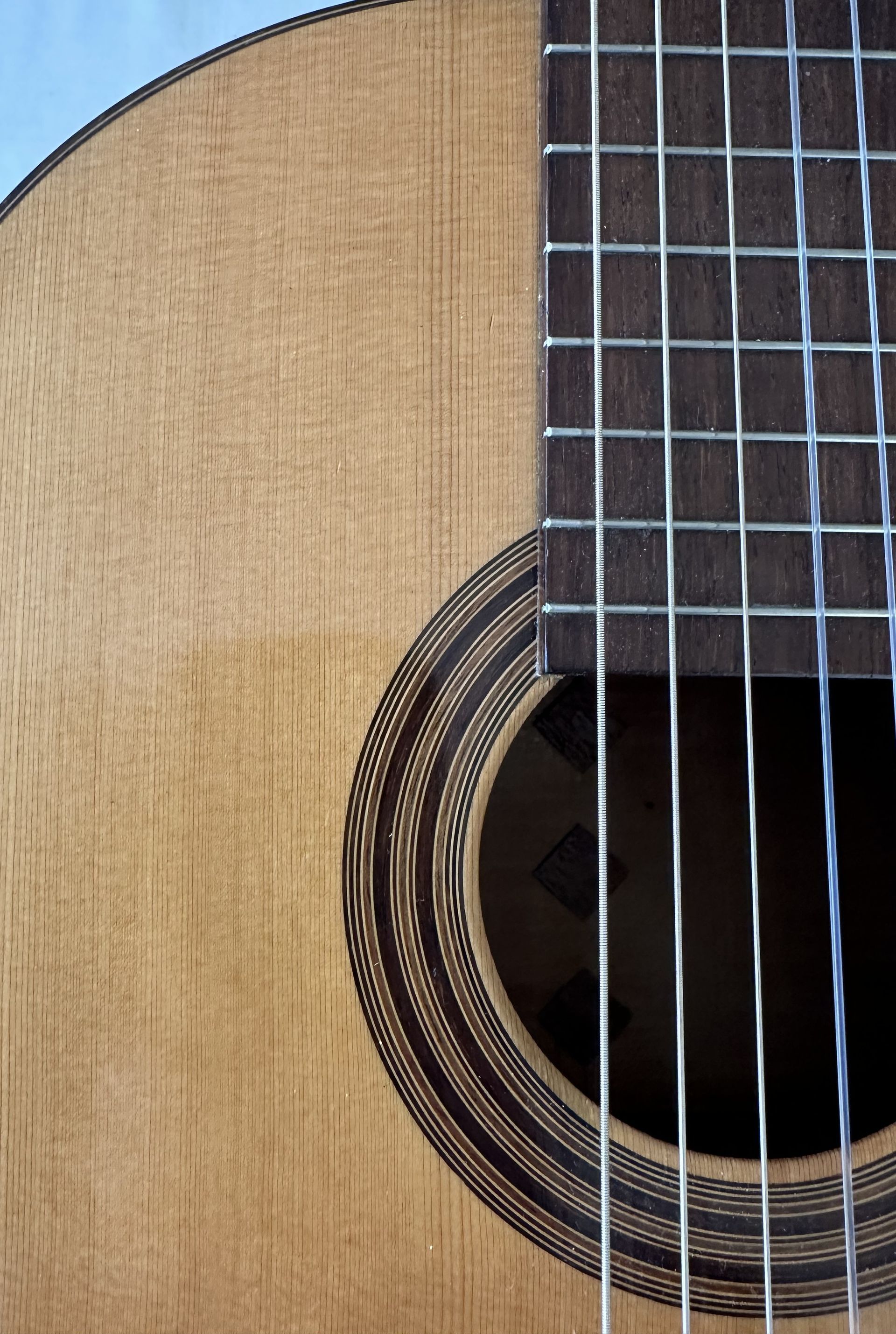 The guitar was made in 2001 and comprises a Spruce top with flamed Maple back and sides. Interestingly the Spruce top is one of the thinnest I have ever come across on a classical guitar, and this help towards its very light feel. The body is smaller than the normal classical guitar and has the small bodied Torres feel. The action is low, around 3mm at the 12th fret, and the neck is straight. it has a 52mm nut width and a 630mm scale length. The bracing is 7 fan and very similar to Torres. A combination of the thin top and Maple back and sides results in a guitar which is bright and responsive, and despite the smaller body size has ample projection. It does show some signs of having been played, which adds to the patina of this interesting guitar.