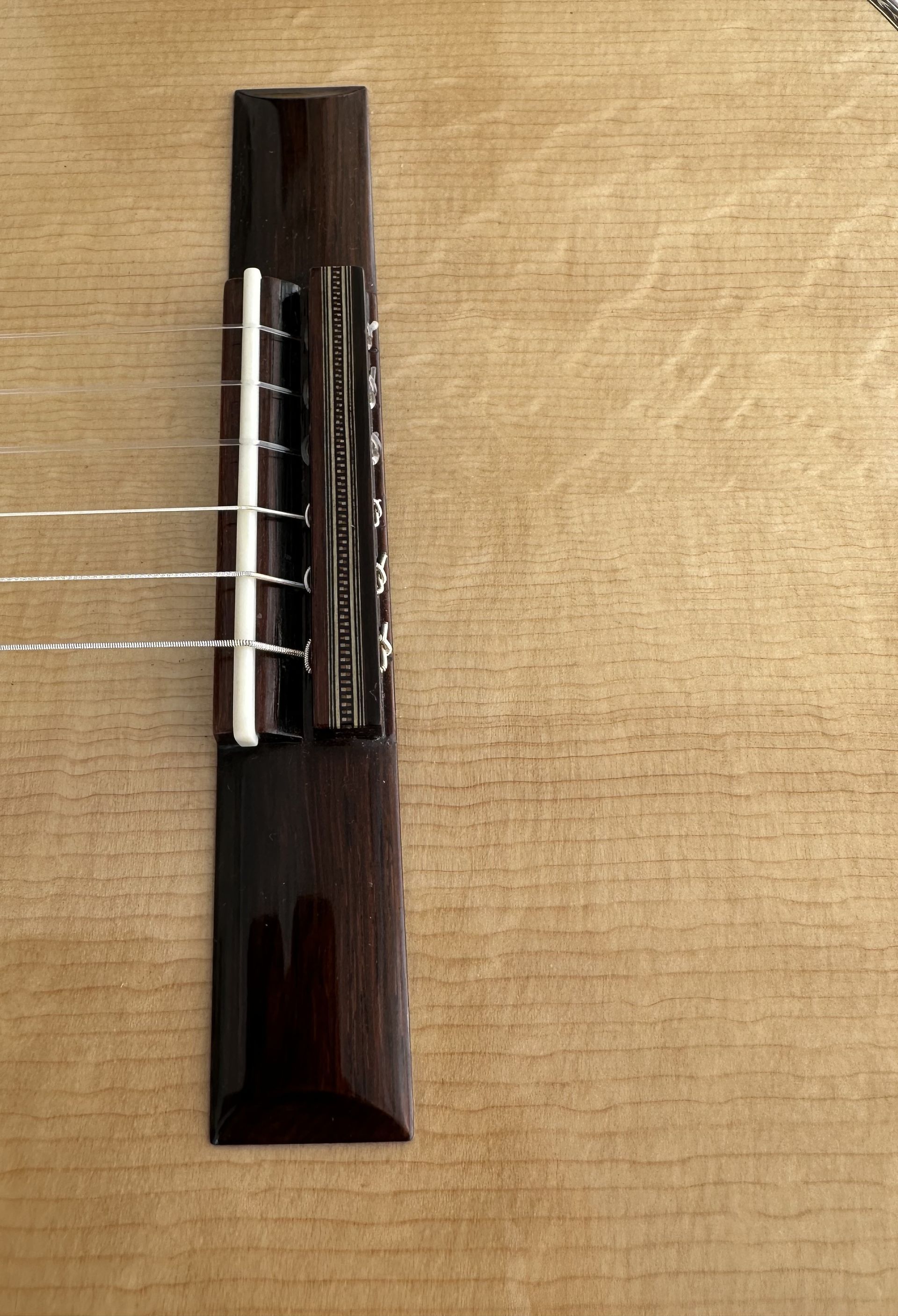 The guitar has a Spruce top with Bear-claw, and beautifully book-matched Quilted Maple back and sides. The photos do not do justice to the French Polished Maple which gives a stunning 3-d effect. David crafted the guitar as a lock down project during Covid and has signed the underside of the soundboard to testify the fact. The workmanship is outstanding, from the beautifully crafted V-joint for the headstock, to David's signature rosette and detailed purfling. The air resonance is F#/G. Whilst looking superb, the guitar also has beautifully elegant tone and excellent projection., emanating from a standard body size and 650mm scale length. Bass and treble responses are outstanding with good balance. Tuners are Gotoh. David keeps to a traditional fan-braced design which results in a light guitar which, along with a nut width of 52mm, results in a guitar which is not only responsive, but also is easy to play. To signify that this guitar is special, David has chosen to give it the name 'Palomino' in contrast to his other guitars which are only dated.