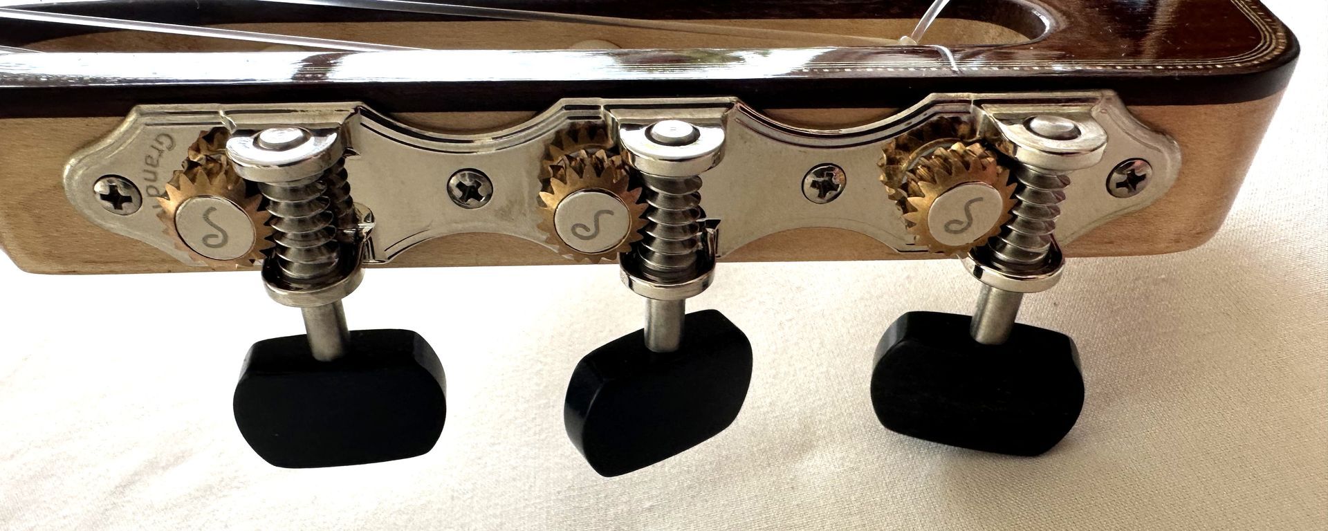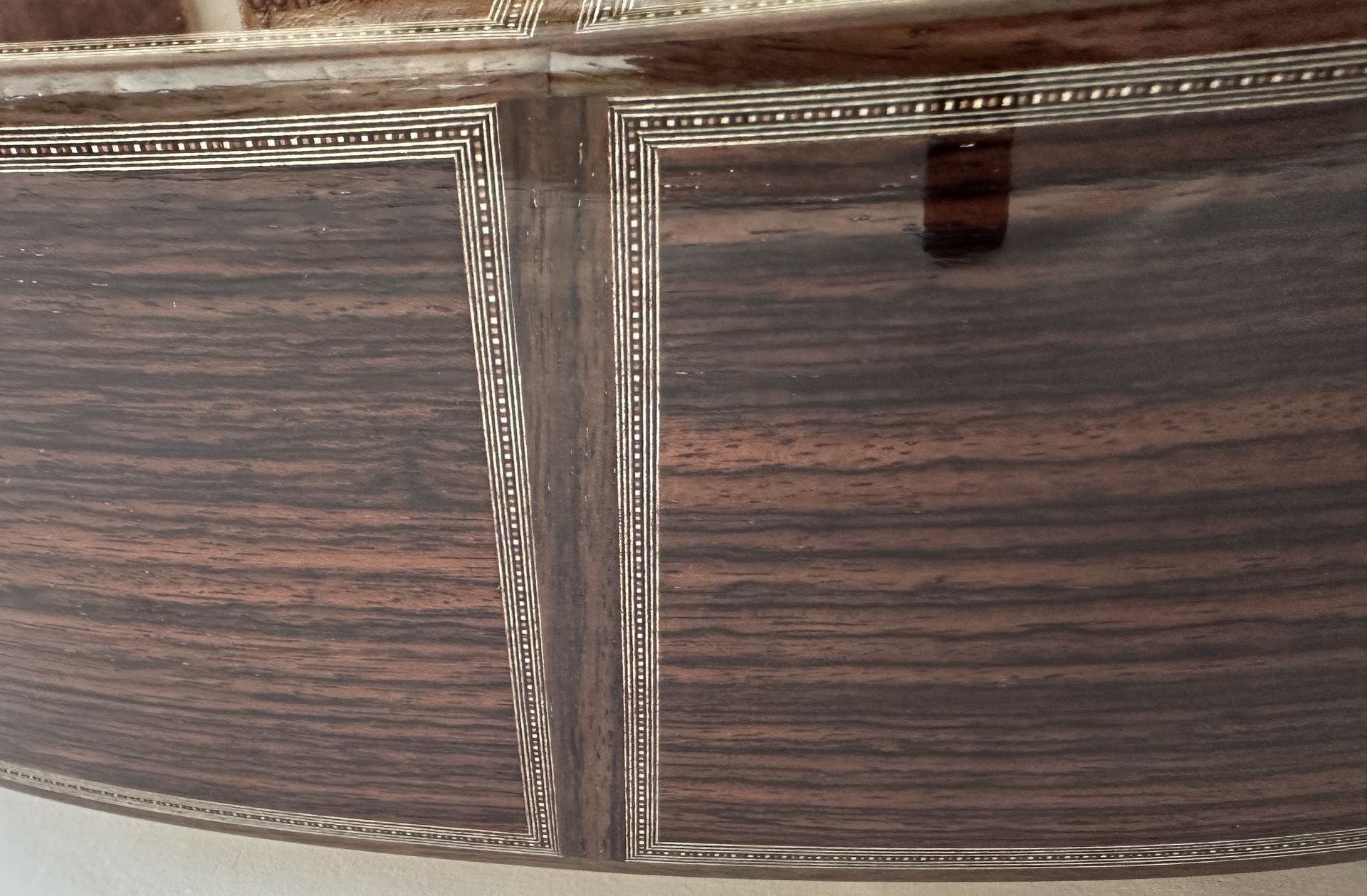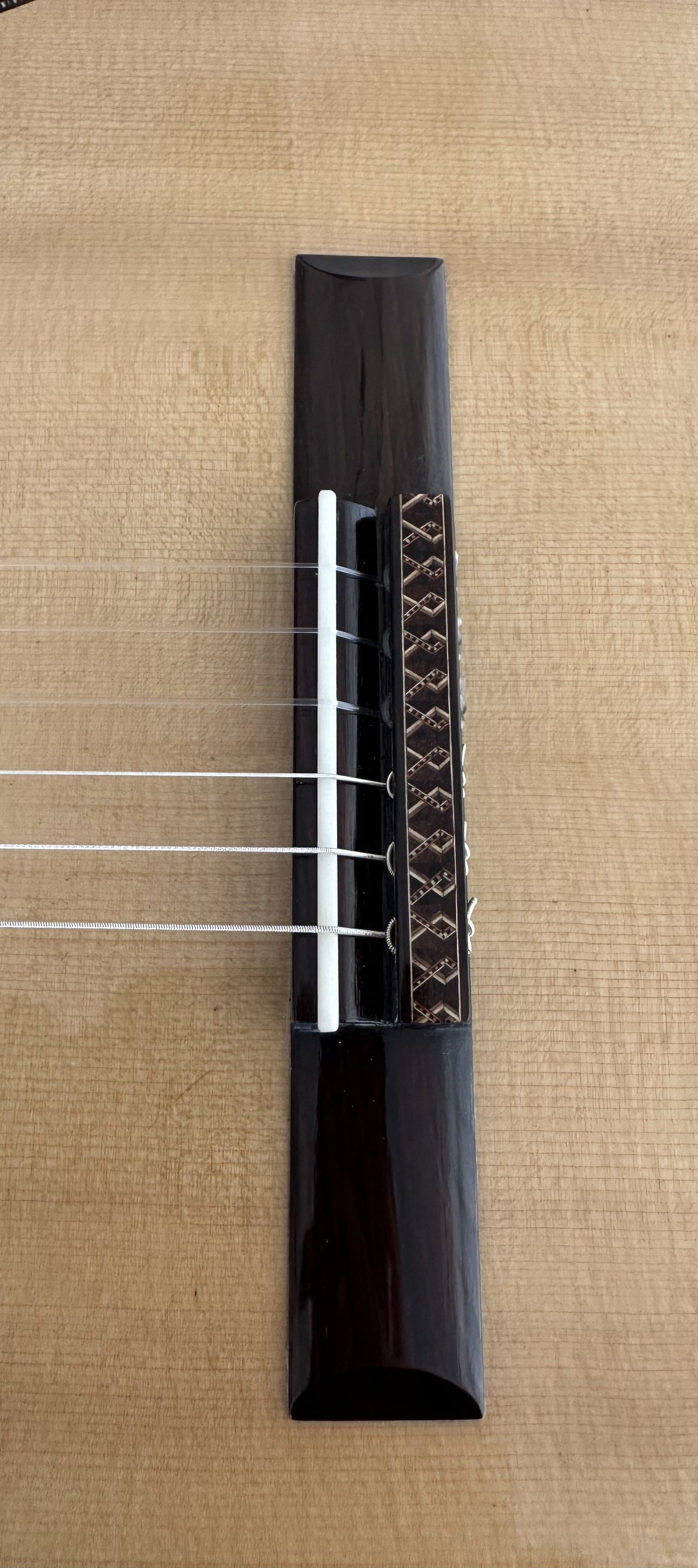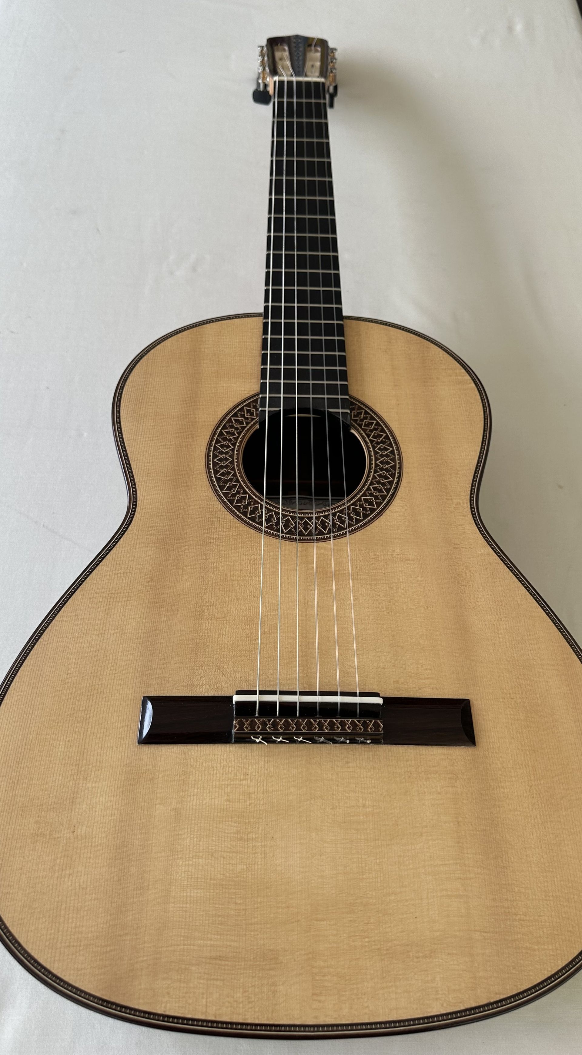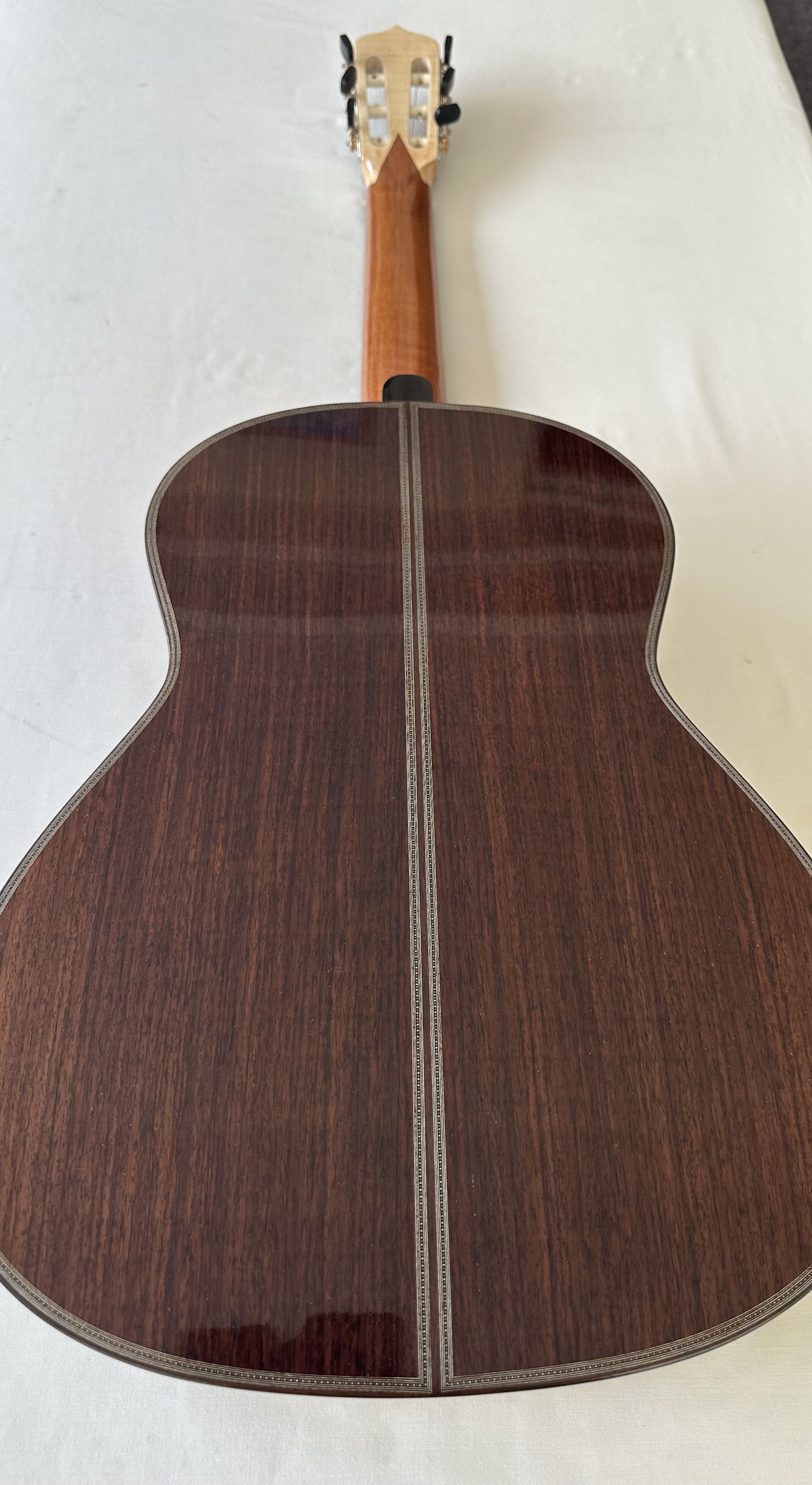 The guitar has a Spruce top and beautifully book-matched back and sides. The workmanship is outstanding, from the beautifully crafted V-joint for the headstock, to David's signature rosette and detailed purfling. Whilst looking superb, the guitar also has excellent tone and volume characteristics emanating from a standard body size and 650mm scale length. David keeps to a traditional fan-braced design which results in a light guitar which, along with a nut width of 52mm, results in a guitar which not only is responsive, but also is easy to play. It is a fine guitar.