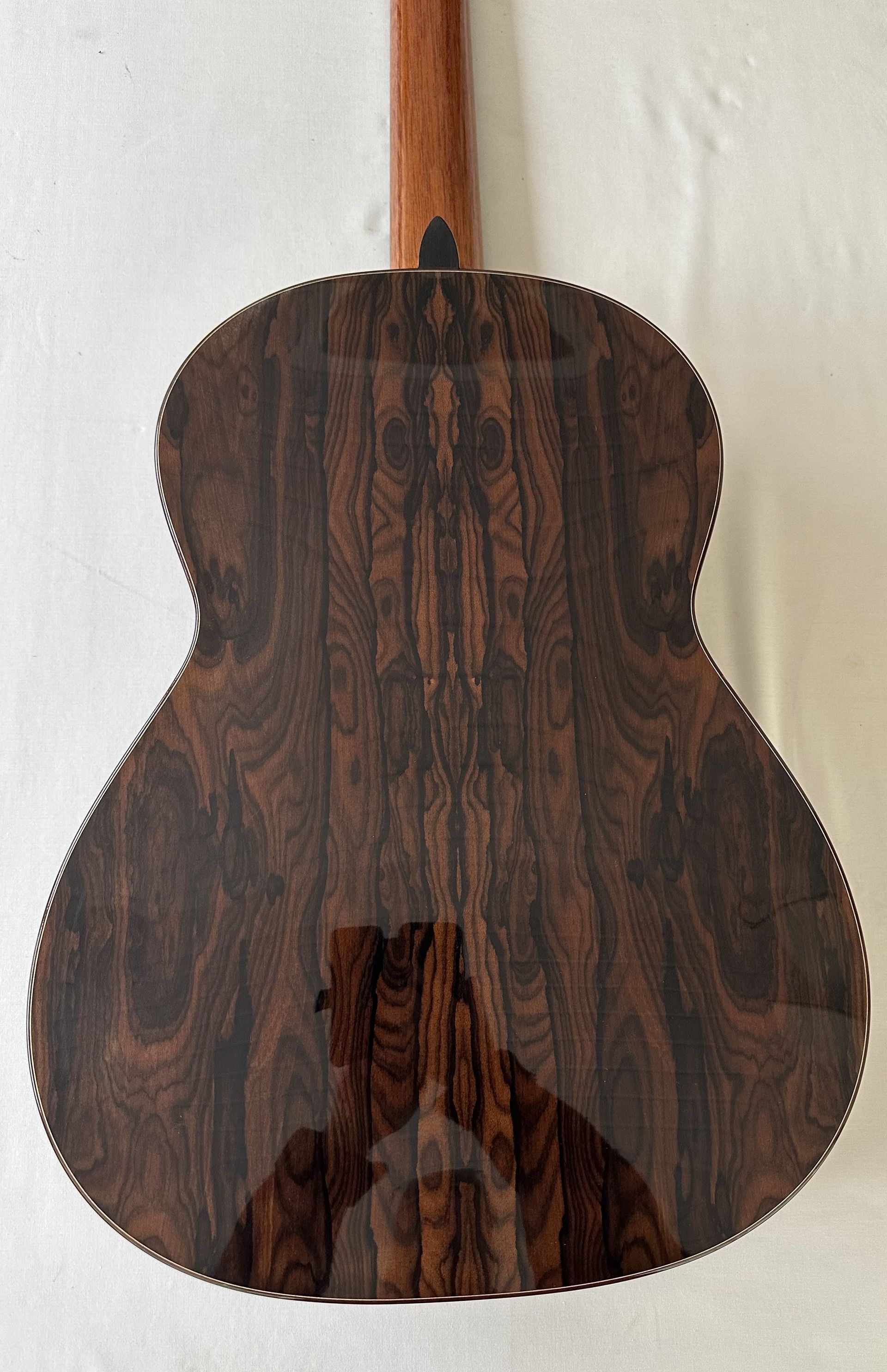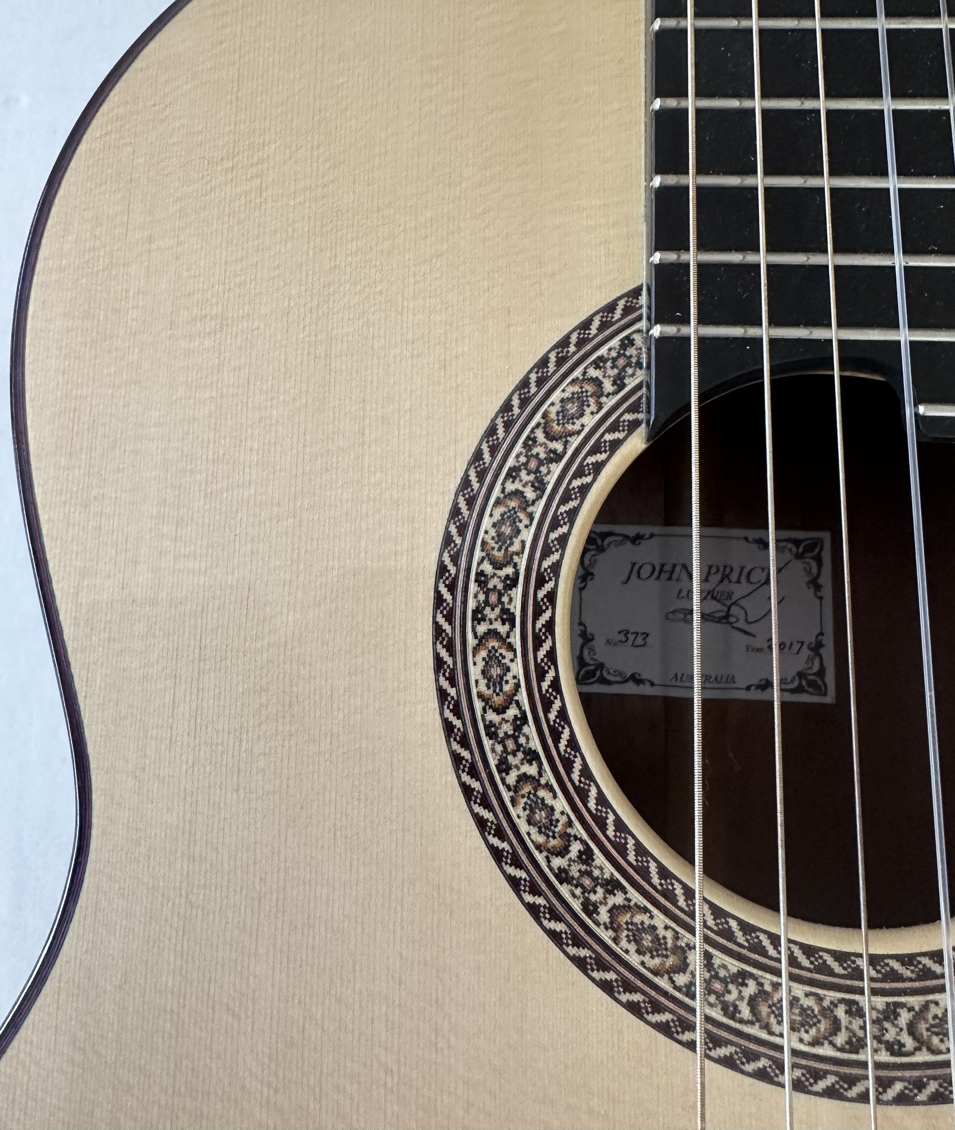 The guitar is in mint condition and is an outstanding example of John's craftsmanship. It features a Spruce top, which following the Australian tradition is lattice braced. The beautifully book matched and figured sides and arched back are doubled to as to increase the volume and projection of this fine guitar. it also features a 640mm scale and a 50mm nut which make it very comfortable to play, especially for the player with slightly smaller hands. String heights at the 12th fret are standard being 4mm and 3.5mm for the low and high E strings respectively. John uses a two piece saddle which allows more precise intonation. This guitar has all the power, balance and projection which one would expect of a concert level instrument.