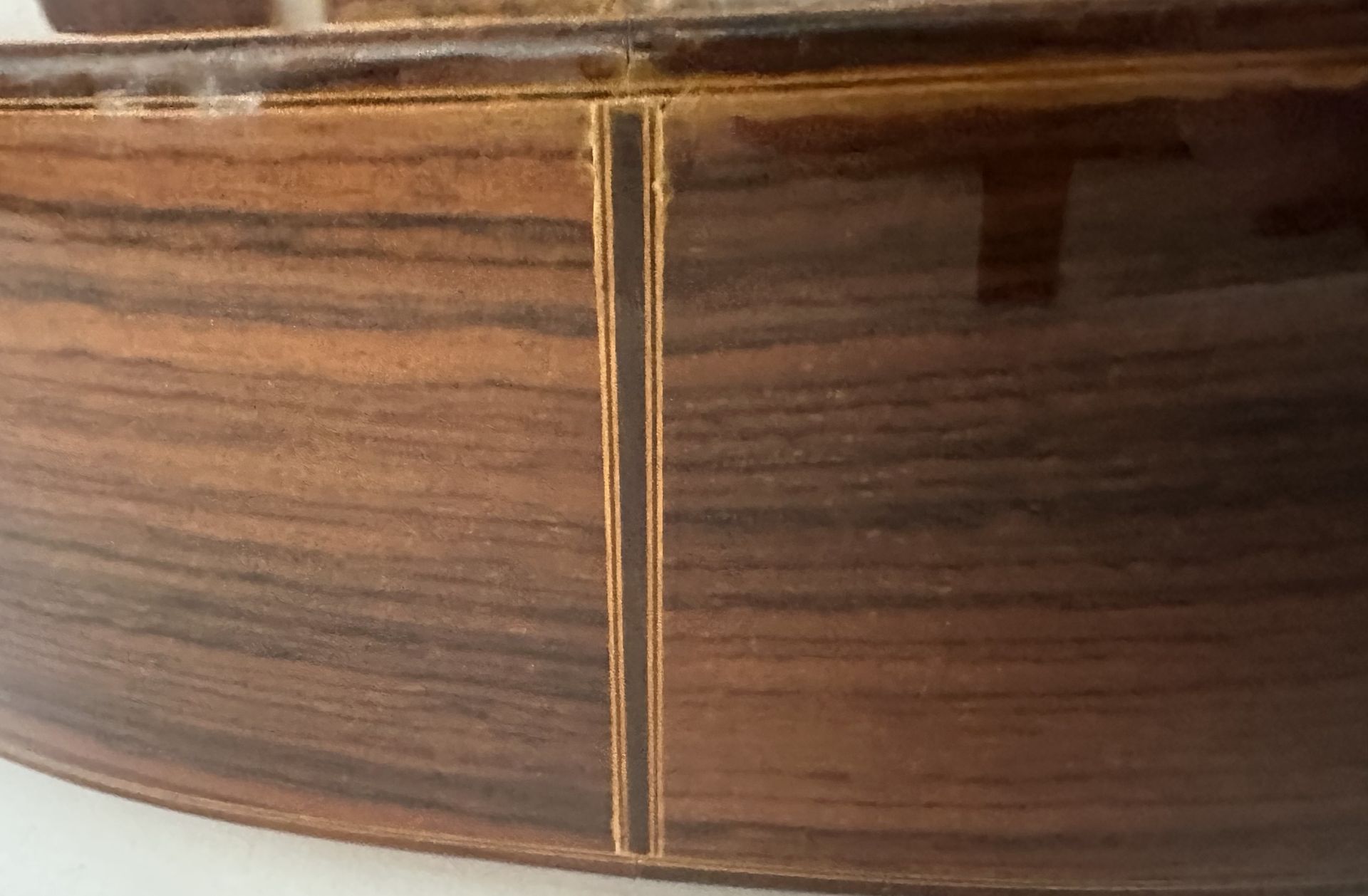 Built in 1966 the guitar comes from what has been described as Kohno's golden period, where he had perfected his art but not moved into the higher production levels which followed his winning the gold medal and involved other workers. For its age the guitar is in supremely good condition with very few signs of having been played over its lifetime on either the Spruce top nor the Indian rosewood back and sides. There are only a few minor marks on the soundboard and the state of the label would indicate time in storage or in a collection rather than being in regular use. The scale length is 650mm and the nut width 51mm. String clearances for the high and low E strings at the 12th fret are 3.4mm and 3.8mm respectively. Internally the bracing system follows that of Arcangel Fernandez, comprising a five fan array. The sound is very rounded and mature with strong basses and bright trebles. This is a fine example of Kohno's early work and very unusual to find a guitar in such remarkably good condition.