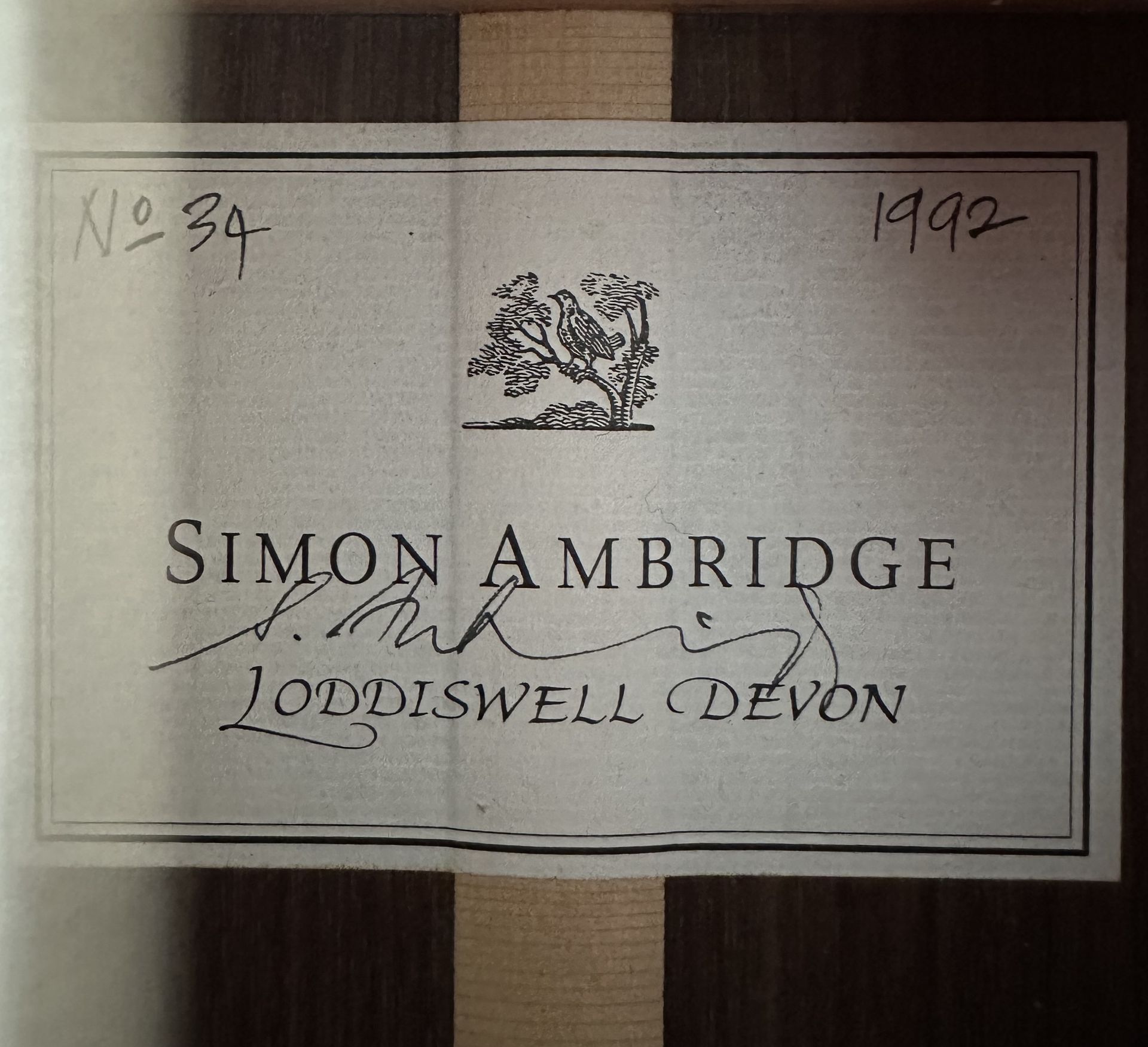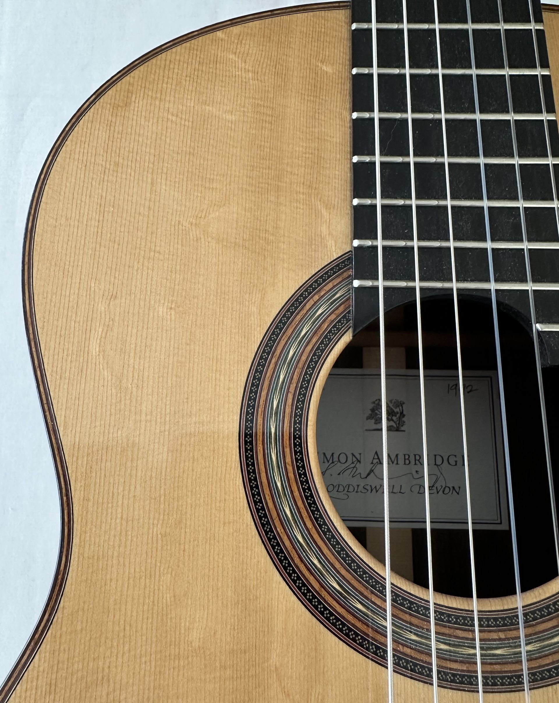 The guitar is one inspired by the smaller bodied Torres design. it features a superb bear-claw figured Spruce top and Indian Rosewood back and sides. The rosette and purfling are deliberately understated but add just enough to the elegance of the design. Whilst the guitar is from the earlier part of Simon's career, the craftsmanship and sound quality are top class. Even though the body is small it has very good projection. The air resonance is G as would be expected from the smaller body. Nut width and scale length are standard as 52mm and 650mm respectively. The guitar is in very good condition, having had only one owner from new. A couple of string whips and a small ding in the rosette are the only significant blemishes on an otherwise superb guitar. The sound is typically Ambridge with a very clear treble response right up the fretboard and rounded basses. This guitar was in my personal collection but is now being offered for sale as I am changing to a shorter scale instrument.