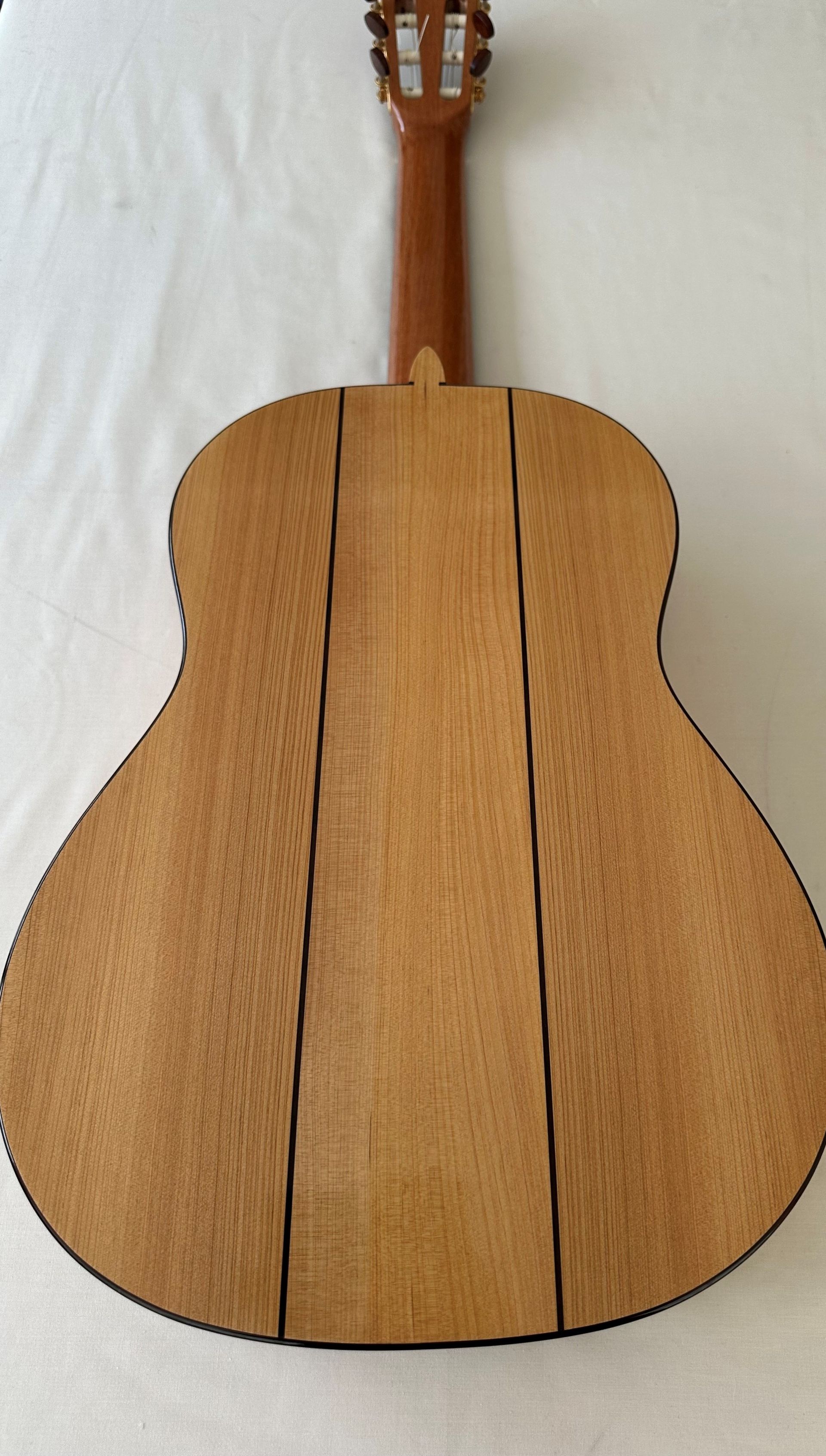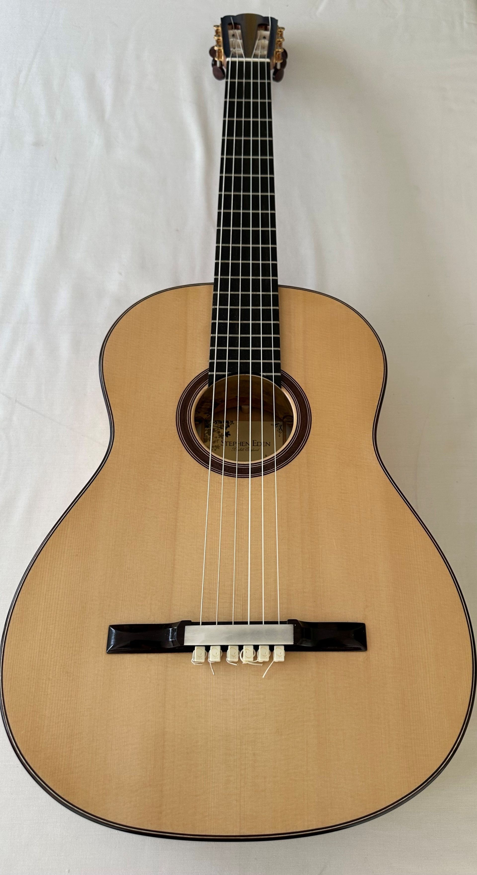 The guitar offered for sale is Stephen's copy of the famous La Leona which was the only one Torres named and the only guitar he kept during his life. Stephen made this copy in 2019 and is the only one of the La Leona design which he has made. It features a high grade Spruce top and Cypress back and sides, with the design incorporating a tornavoz. The body is slightly smaller than a standard classical but the combination of woods and the tornavoz produces a highly responsive guitar with great volume. The lightweight feel of the guitar provides an intimate playing experience without any loss of projection. The Schaller Grand Tuners ensure easy and accurate tuning and the sound has an immediacy and brightness of attack as well as great balance across the strings. Stephen chose to modify the bridge design slightly and use string ties with a closing bridge plate, which enhances the aesthetics of the guitar. overall the guitar is in excellent condition and there is a wonderful smell of new cypress wood when opening the case. I would summarise the guitar as having such a character that it is a joy to play.