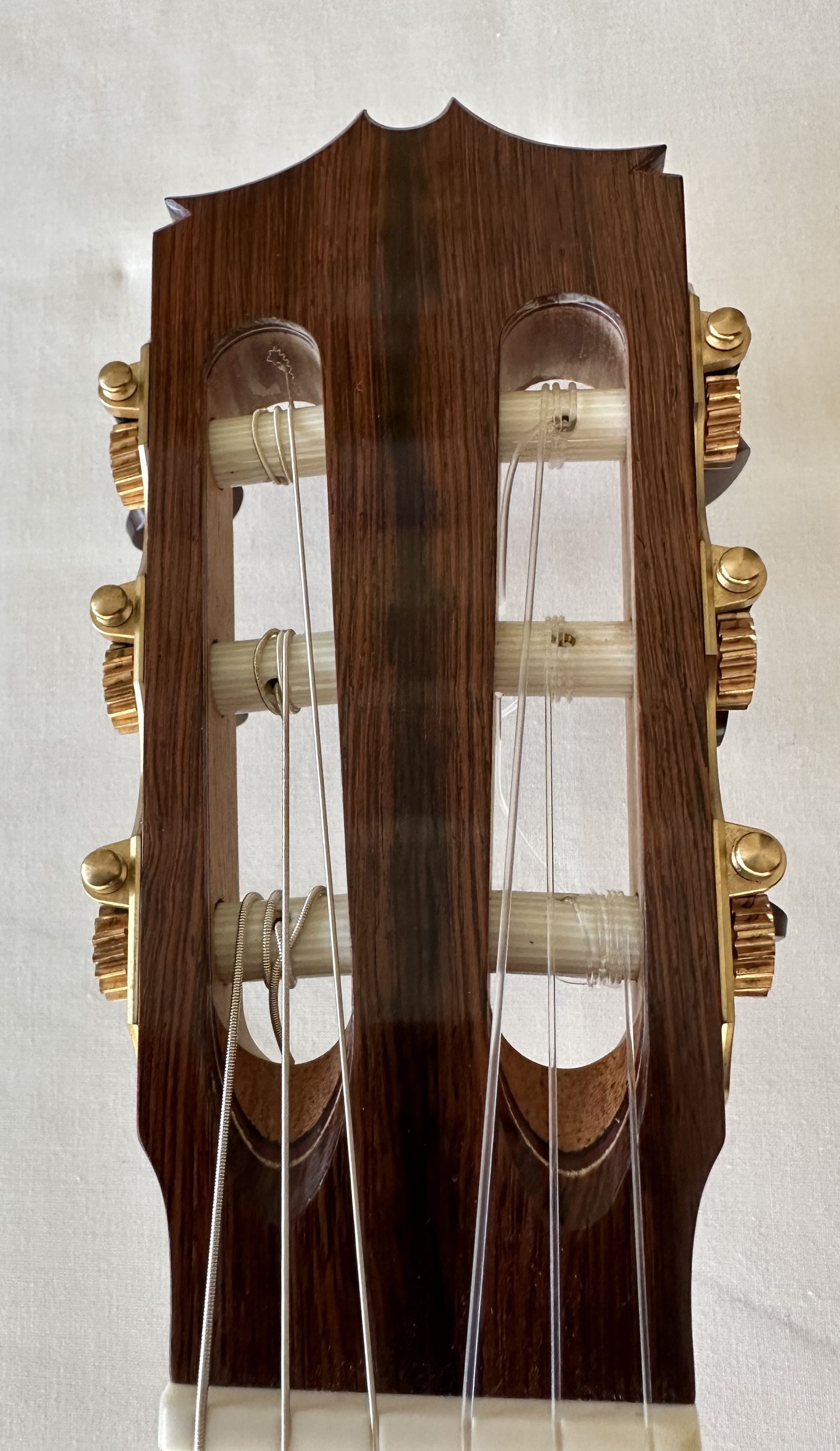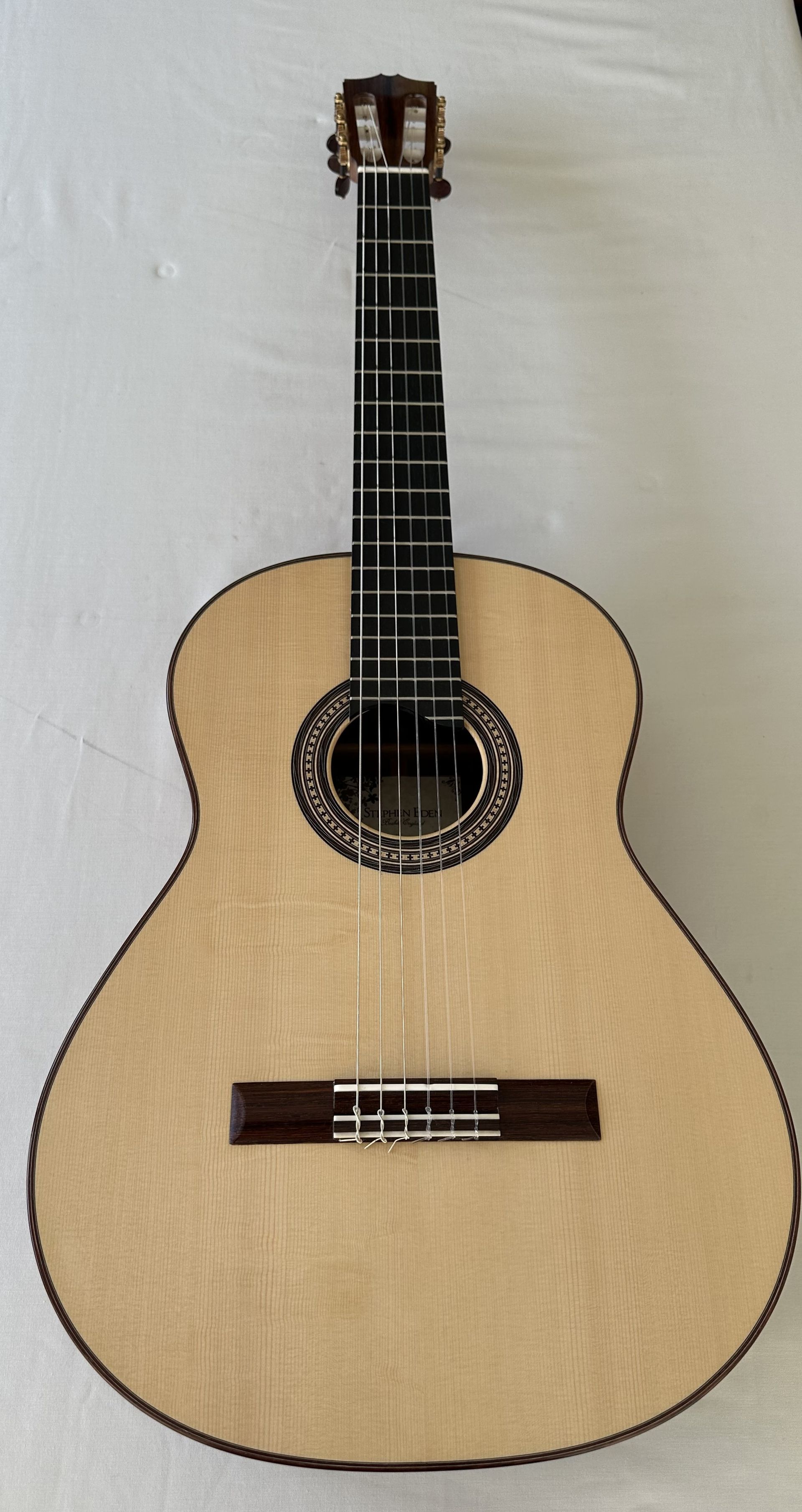 This guitar, with its high grade Spruce top provides an impressive Spanish sound with more control and focus on the fundamental of the note. It has beautifully book-matched back and sides together with an Ebony fretboard. The tuners are by Scheller, giving the guitarist sublime quality in tuning.